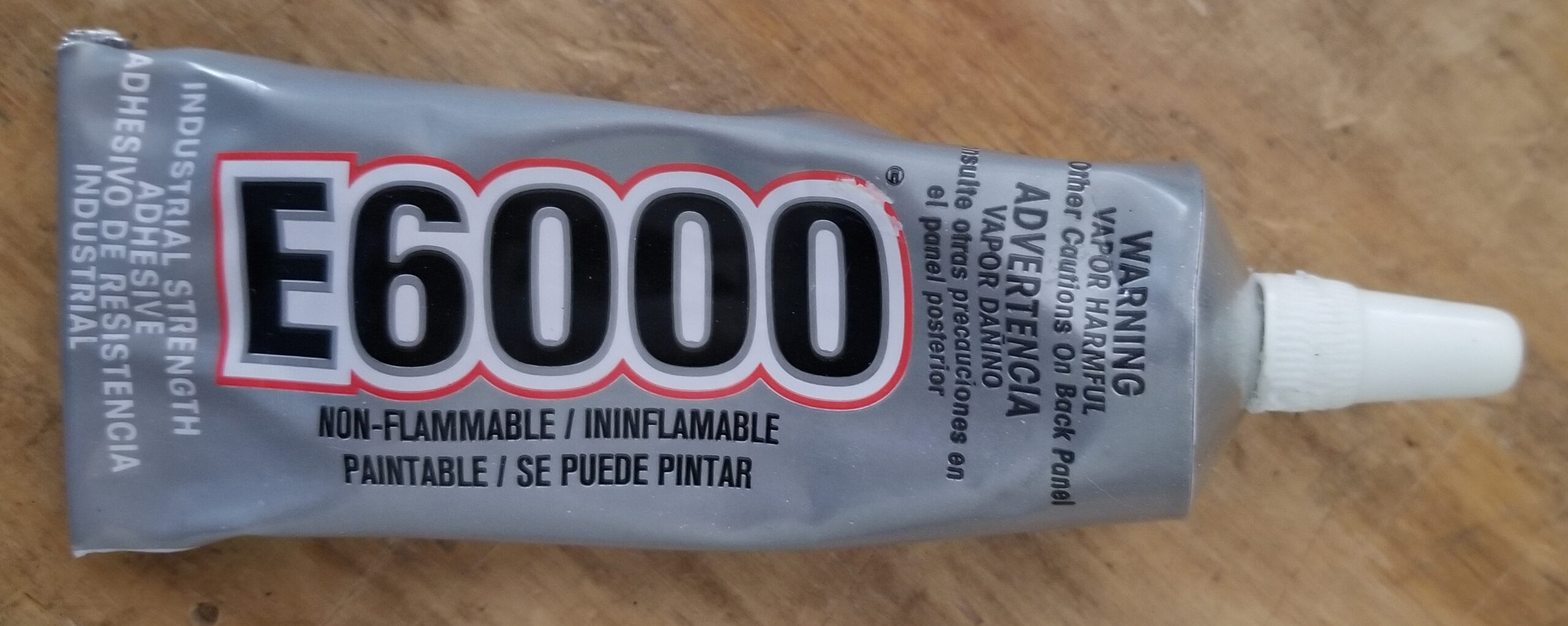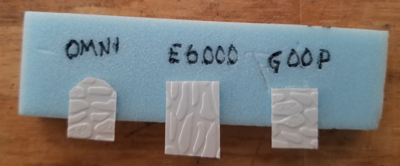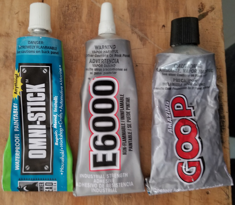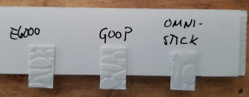 So I did a little testing with three tubed products: Omni-Stick, E6000, and Goop. (E6000 is the recommended glue for all the materials I’m using.)